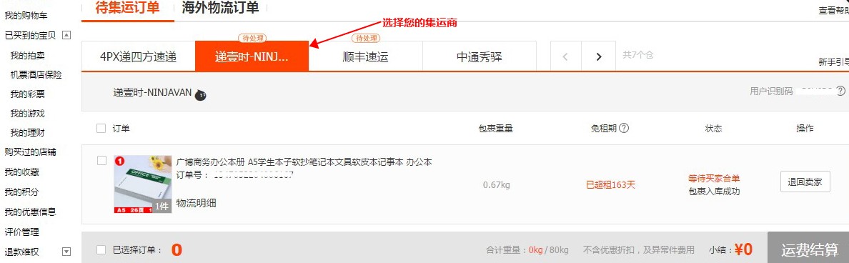 第一步:请您来到【我的淘宝】-找到页面左侧全部功能中【官方集运】按钮,进入集运页面后,点击【待集运订单】后,点选您选择的转运商图标。
